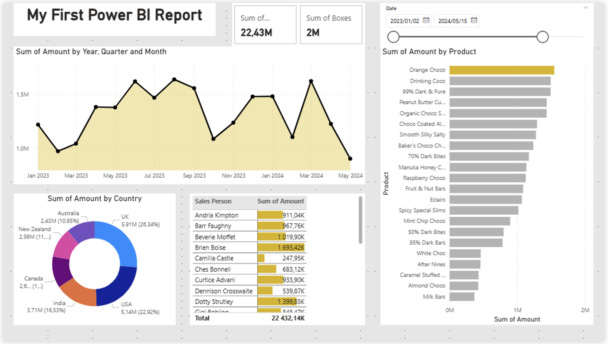 - step-by-step process of creating a complete business report using Power BI, from loading and preparation of sample data to formatting visuals and sharing the report with others.
